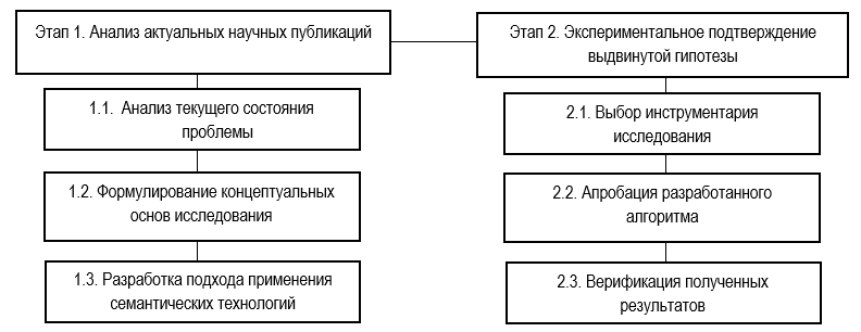 Схема исследования включает два последовательных этапа: на первом этапе проводится системный анализ актуальных научных публикаций и практических решений в рассматриваемой области, что позволяет сформировать теоретико-методологическую базу исследования; на втором — осуществляется экспериментальное подтверждение выдвинутой гипотезы посредством апробации разработанных методов и анализа полученных результатов. Обобщенная схема исследования представлена на рисунке 1.