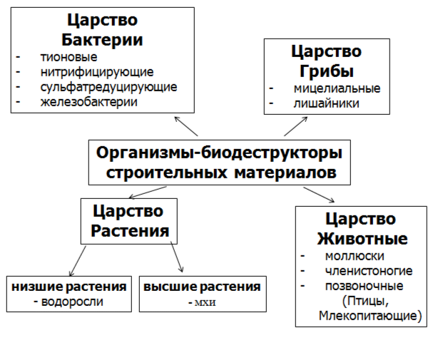 Рис. 1. Многообразие биодеструкторов строительных материалов