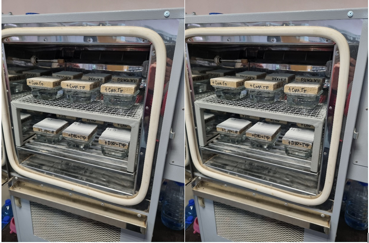 Для проведения исследования изготовлены образцы 100×100 мм, твердевшие 28 суток в естественных условиях. Испытание на паропроницаемость проводилось методом «мокрой чашки» по ГОСТ 25898-2020. Для проведения исследования использовалась климатическая испытательная камера «Тепло-Влага М 0/100-80 КТВ», при поддержании в камере постоянной температуры 23℃ и влажности 50% (см. Рис. 1).