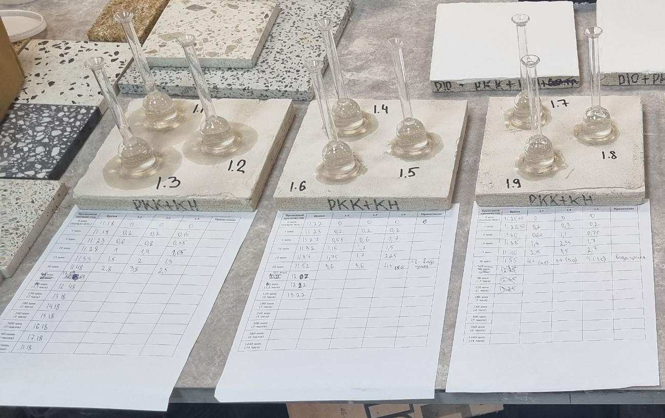 Для испытаний на водопоглощение были изготовлены образцы 200×200×24±1 мм, твердевшие естественных условиях 28 суток. Определение водопоглощения проводилось с применением трубок Карстена. Данный прибор в соответствии с европейскими стандартами (DIN 4117 и DIN 1048) рекомендован для определения степени водопоглощения. Регистрация объёма поглощённой воды проводилось через фиксированные интервалы времени: 1, 5, 10, 15, 30, 45, 60, 90, 120 минут и далее через каждые 60 минут. Испытание продолжается до момента достижения поглощения равного 4 мл или прекращения роста водопоглощения в течение 360 минут.
