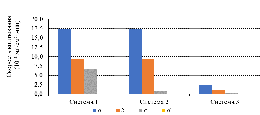 У образцов подсистемы d к этапу времени 360 мин среднее значение поглощенной воды составляло 0,29 мл, при этом максимальное поглощение воды составило 0,5 мл. Скорость впитывания на отметке в 30 мин составляла 0 мл/см²·мин и только моменту времени 240 мин данный показатель вырос до 0,1 10-3·мл/см²·мин