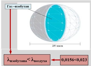 В работе предложено ввести в состав полимерные микросферы, представляющие собой маленькие сферические полые шарики из пластика с заключенным в них газом — изобутаном, коэффициент теплопроводности которого на 32% ниже, чем у воздуха (Рис. 2). Это должно снизить скорость прохождения тепловых потоков через пенный материал и коэффициент его теплопроводности.