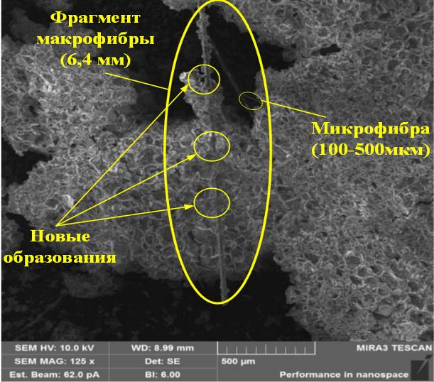 На Рис. 6 показаны результаты проведенной электронной микроскопии образца из которых видны новообразования на поверхности макрофибры. На поверхности микрофибры новообразования отсутствуют, так как она не покрыта замасливателем.