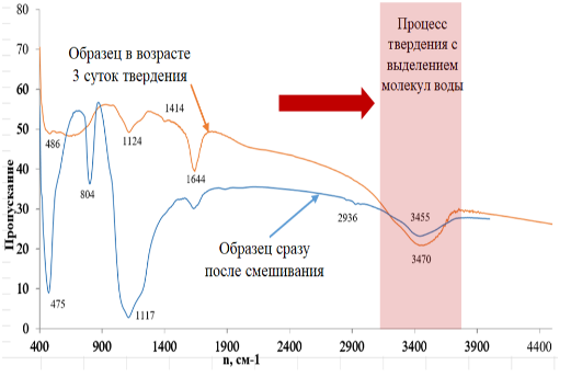Из Рис. 8 видно, что полосы поглощения в области 3447 см–1 (характеризуют H2O в составе образцов) уменьшаются к трем суткам твердения по сравнению с образцами, обработанными сразу после смешивания, что говорит о выделении воды в окружающую среду при уплотнении геля. Присутствие молекул воды подтверждают высказанные предположения о возможности продолжения процессов упрочнения во времени, обеспечивающих сохранение полученных свойств в период срока эксплуатации объекта.