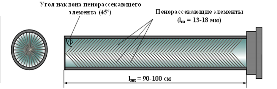 Новое техническое решение связано с получением пенного материала в состав которого входит макрофибра. Существующие средства получения препятствуют прохождению макрофибры и ведут к ее неравномерному распределению в их объеме за счет конструкции пенообразующего патрона. В связи с этим в работе предложено получение в пеногенераторе (используется для получения строительных пен, Рис. 9), с новым устройством пенопатрона (Рис. 10), в котором пенорассекающие элементы, имеют консольное закрепление и расположены под углом к стенкам пенопатрона. Это позволяет макрофибре беспрепятственно проходить через всю длину патрона, равномерно распределиться в объеме материала и как следствие не превысить требуемую ширину раскрытия трещин (bтр≤0,2мм).