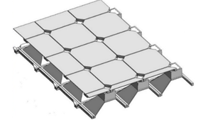 В центре внимания находится инновационная конструкция покрытия, особенностью которой является комбинированная структура с использованием различных материалов. Основу системы составляют пирамидальные элементы, изготовленные из сталефибробетона, которые ориентированы вершинами вниз. Конструкция характеризуется наличием массивного железобетонного основания, обеспечивающего необходимую прочность и устойчивость всей системы.