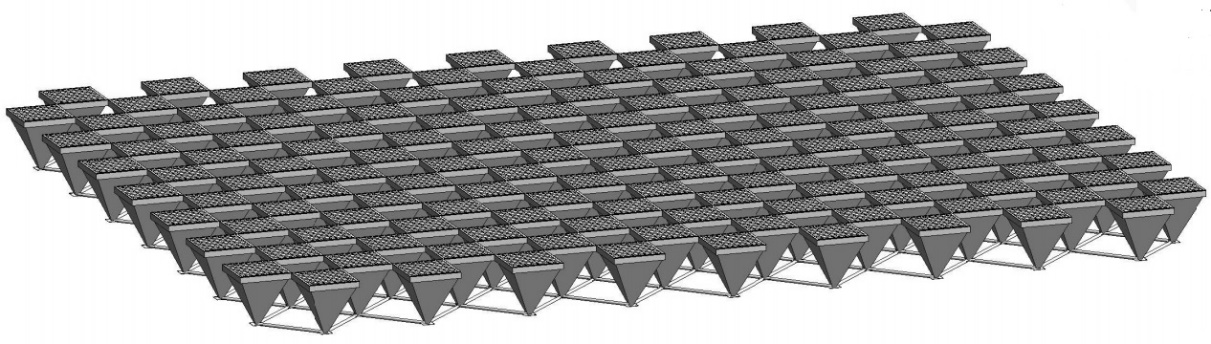 В современном строительстве нашли применение два типа структурных покрытий из сталефибробетона. Регулярная конструкция базируется на пирамидальных элементах с направленными вверх вершинами, которые дополняются плитами жесткости. Благодаря такой компоновке возможно эффективное использование покрытия в помещениях различной планировки [6-7].