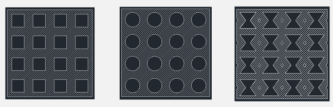 б) с круглыми пустотами, в) с ауксетической возвратно-вогнутой структурой