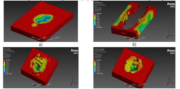 На данном этапе было установлено, что традиционные решения плит с круглыми (Рис. 2, г) и квадратными пустотами (Рис. 2, в), а также с воздушной прослойкой (Рис. 2, б), не гарантируют требуемого уровня защиты, приводя к полному пробитию плиты покрытия и уничтожению несущих конструкций.