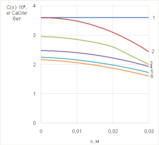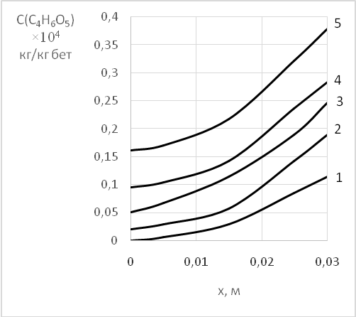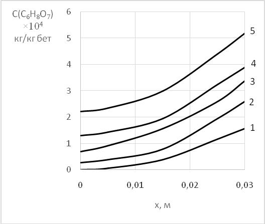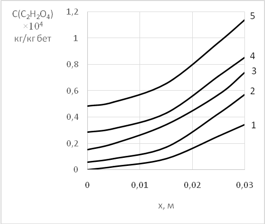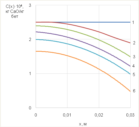 Необходимость мониторинга, последующего прогнозирования и планирования мероприятий по устранению дефектов и профилактики ЖБС обусловлена результатами исследований авторов [26], в которых для определения срока достижения концентрации 0,05 г/л органических кислот, образующихся на поверхности бетона в результате жизнедеятельности черной плесени, у поверхности стальной арматуры в железобетоне построены профили их концентраций по толщине бетонного покрытия (рисунок 3).