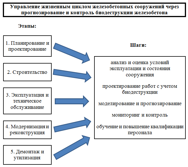 - Комплексный подход к управлению ЖБС: Внедрение методики управления жизненным циклом железобетонных сооружений, основанной на прогнозировании и контроле биодеструкции, обеспечивает комплексный подход к поддержанию их надежности и долговечности.