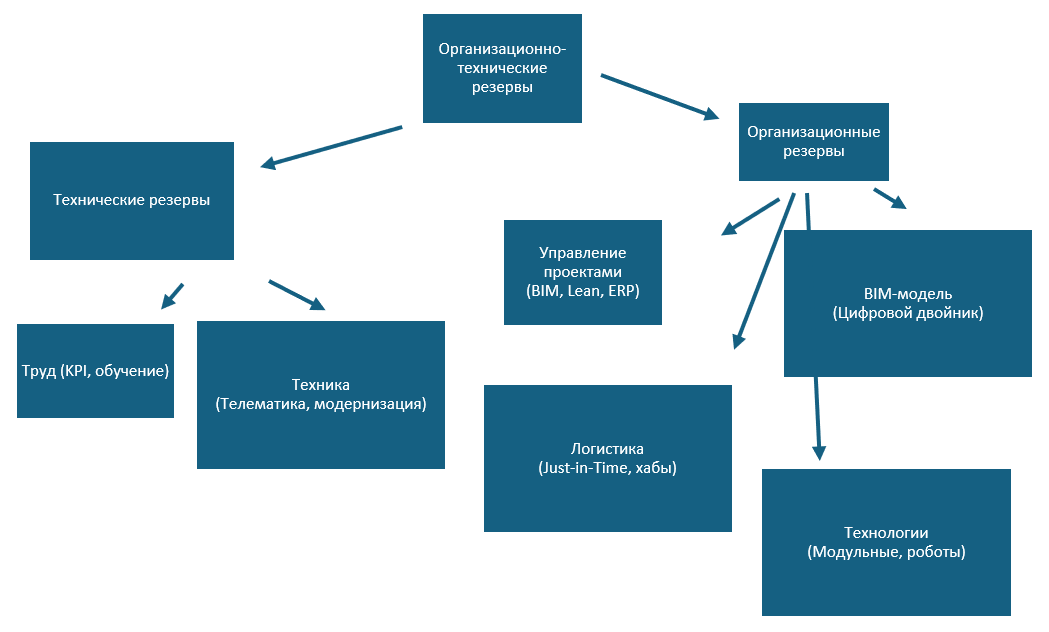 In today's competitive construction industry, the constant search for ways to improve efficiency is not just an advantage but a vital necessity. A key source of hidden growth potential is organizational and technical reserves, representing untapped optimization opportunities embedded in management systems, technology, and production facilities. This article provides a comprehensive analysis of these reserves and the development of practical approaches to mobilizing them to improve construction efficiency. The paper provides a detailed description of the nature and classification of reserves, which are divided into two interrelated groups. Organizational reserves are examined through the lens of project management system improvements, including the implementation of Lean Construction and BIM methodologies, digitalization of planning and control processes, and optimization of logistics and personnel motivation. Technical reserves are analyzed in the context of modernization of the material and technical base: the use of innovative prefabricated and modular construction technologies, the introduction of new materials, robotics, and the renewal of the construction equipment fleet using telematics systems. Particular emphasis is placed on the synergistic effect arising from the simultaneous implementation of organizational and technical improvements. It is demonstrated that an integrated approach, such as the implementation of BIM technologies that coordinates the operation of updated equipment and optimized supply chains, enables maximum results. This article develops a scientifically based methodology for mobilizing organizational and technical reserves (OTR) to improve construction efficiency. The methodology includes systematic identification, quantitative assessment, and ranking of key reserve factors, as well as the construction of cause-and-effect models of their impact on integrated performance indicators (timeframe, cost, and quality). Based on the analysis, a set of interrelated organizational and technical measures is proposed, the implementation of which ensures a synergistic effect. The results of the study were tested using simulation modeling and presented in the form of graphs, diagrams, and matrices, allowing the methodology to be recommended for practical implementation by construction company managers