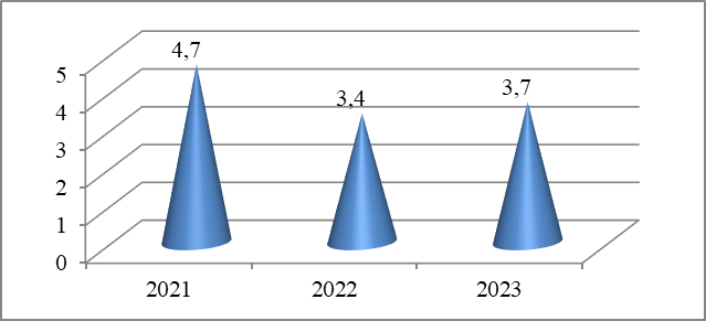 По данным рис. 1., доля ВДС строительства в экономике региона за 2021 – 2023 гг. демонстрирует существенные колебания.