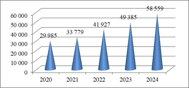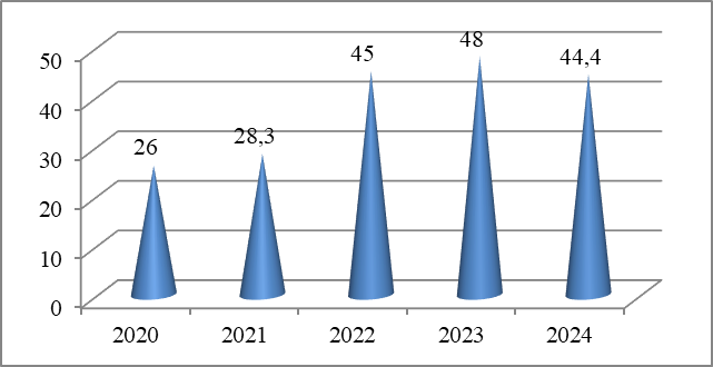 Инвестиции в основной капитал (рис. 3), как индикатор, отражают кейнсианский подход. Положительная динамика и пик 2023 года (48 млрд. рублей) сменился спадом в 2024 году.