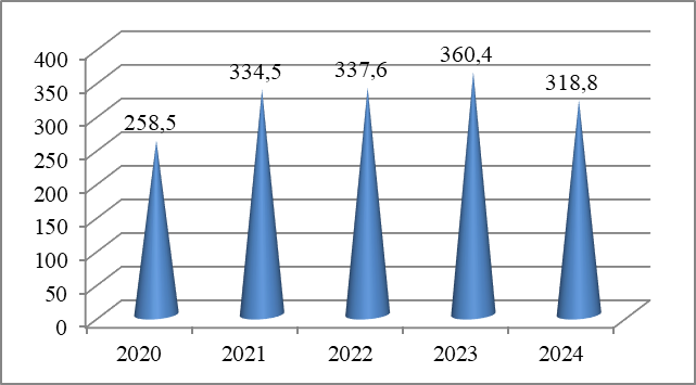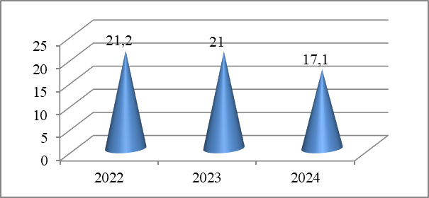 Ввод жилой площади (рис. 5), как один из индикаторов развития отрасли в экономике региона, показывает падение на 11,6 % в 2024 году при общей тенденции роста предыдущих лет, что является сигналом «охлаждения рынка».