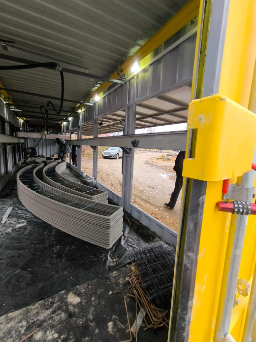 Второй вид оборудования относится к возимым и позволяет доставлять 3D-принтер в контейнере непосредственно на строительную площадку, уменьшать влияние неблагоприятных климатических условий по сравнению с полевым 3D-принтером, но имеет ограничения по размеру изготавливаемых элементов по размеру контейнера. 3D-печать с использованием теплой воды идет до +10 градусов внутри контейнера с применением технологии инфракрасного прогрева бетона. Возимый 3D-принтер в контейнере компании «Три оси» показан на рисунке 2.