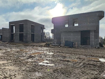 После установки напечатанных стеновых блоков в проектное положение согласно схеме сборки и монтажа во внутреннее пространство укладывается полистиролбетон марки D300-450 толщиной около 400 мм, что позволяет без дополнительного утепления наружных ограждающих конструкций обеспечивать тепловую защиту здания (рисунок 4). Швы затираются тем же составом для 3D-печати, обычной штукатурной смесью на основе песка или цемента или монтажной пеной для блоков. Особое внимание уделяется стыку между нижним рядом сборных элементов конструкций и фундаментной плитой, который заделывается с помощью клея для камня для фасадных работ. Как и при строительстве с помощью традиционной технологии предусмотрена обмазочная гидроизоляция.