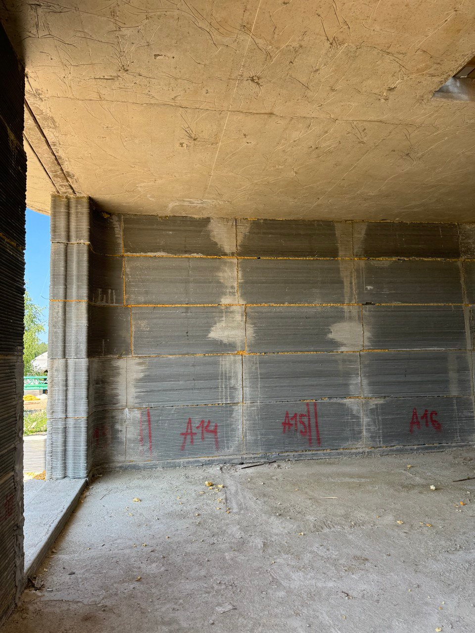 Армирование печатаемых конструкций выполняется с помощью металлической или композитной арматуры, просечным листом или сеткой. Также применяются различные скобки. Конструктивные особенности здания включают в себя устройство внутри пространства двух ограждающих напечатанных слоев несущих колонн с армированием каркасами со стержнями диаметром 12 мм, которые связываются с арматурными выпусками фундаментной плиты. Выпуски армирования колонн предусматривают дальнейшее соединение с арматурными стержнями монолитных перекрытий. Материалом для несущих колонн и перекрытий обычно является бетон марки B25.