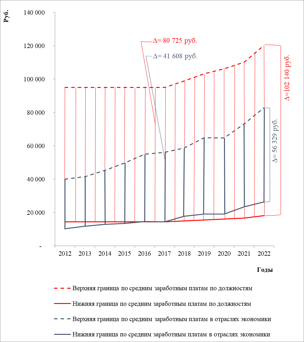 Предлагаем проиллюстрировать статистическое сопоставление размаха и вариации максимальных и минимальных значений средних заработных плат по должностям в анализируемой отрасли на примере последних наиболее показательных отчетных десяти периодов, а именно с 2012 года по 2022 год, с аналогичными усредненными значениями по отраслям экономики в Республике Дагестан, Республике Татарстан, Краснодарском крае, Ставропольском крае, Нижегородской области, Ростовской области, которые представляют средний по экономическим значениям кластер по Российской Федерации.