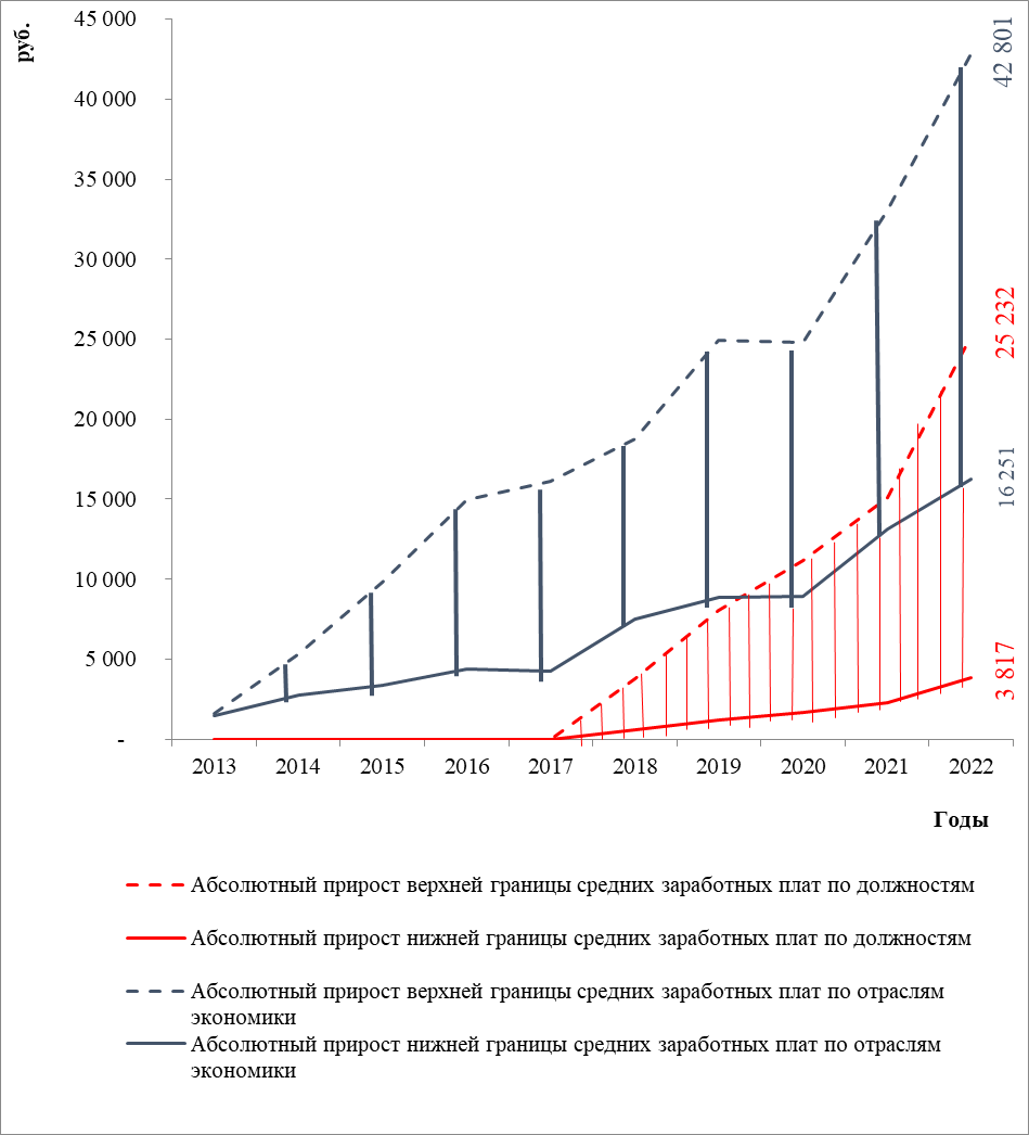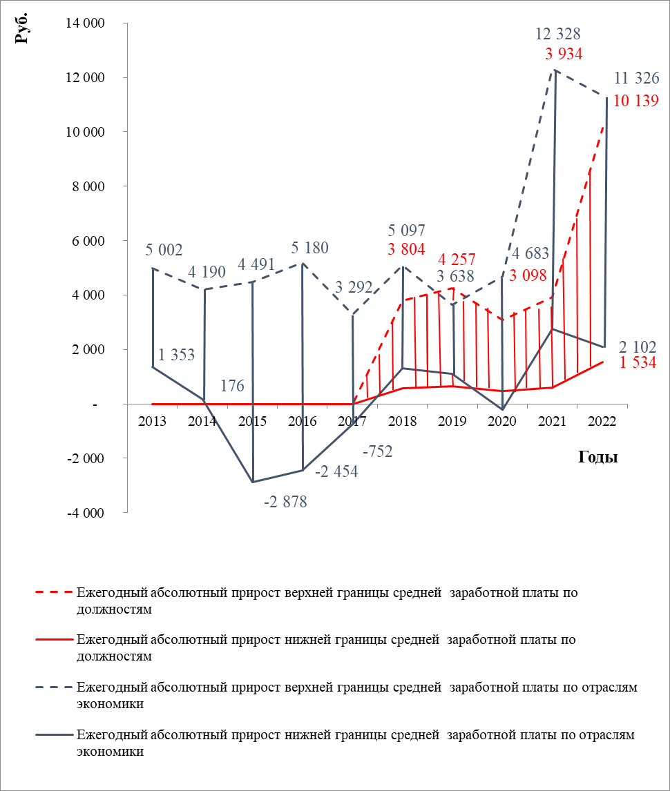 Рис. 2. Сопоставление базисных абсолютных приростов верхних и нижних границ значений средних заработных плат, руб.
