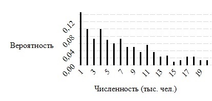 Рассмотрим решение задачи для Плана 3, а по остальные прокомментируем более кратко. Распределение количества студентов в различных ПВО Минобрнауки РФ (и соответственно – их бюджетов) представлено на рис. 2. Фрагмент бюджетов ПВО и среднего (ожидаемого) ущерба приведены табл. 1.