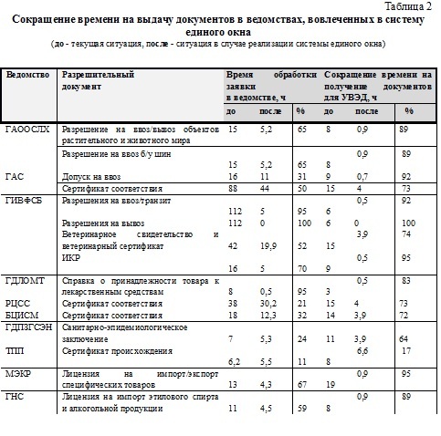 За счет реализации вышеперечисленным рекомендаций по реинжинирингу достигается существенное сокращение времени и трудозатрат сотрудниками ведомств на выдачу разрешительного документа. Кроме того, сокращается время заявителей – участников внешнеэкономической деятельности. В табл. 2 приведены индикаторы сокращения затрат в результате внедрения единого окна.