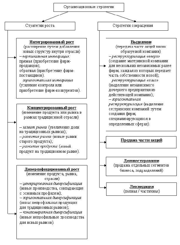 Стратегические организационные изменения стали высокоэффективным рыночным инструментом повышения конкурентоспособности бизнеса и рассматриваются как комплекс мероприятий по приведению условий существования компании в соответствие с изменяющимися факторами внешней среды и выработанной стратегией развития. В процессе реструктуризации в компании происходят важнейшие изменения в стратегических хозяйственных областях, в организационно-правовой форме, в структуре управления. Рассматривая область изменений в стратегических хозяйственных областях, можно выделить два типа изменений в организационной стратегии: стратегия роста и стратегия сокращения. Классификация стратегий роста и сокращения представлена на рис. 1.