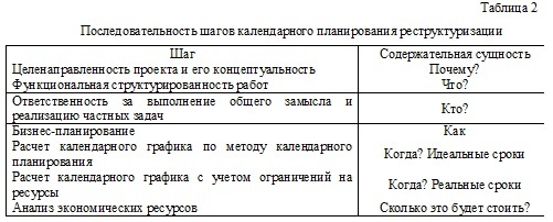 Королькова Е.М. отмечает, что «основным методом построения и контроля процесса реструктуризации является календарное планирование, реализуемое в виде итеративного циклического процесса» [3]. Каждый шаг этого процесса подразумевает необходимость ответа на некоторые обобщенные вопросы, представленные в табл. 2.