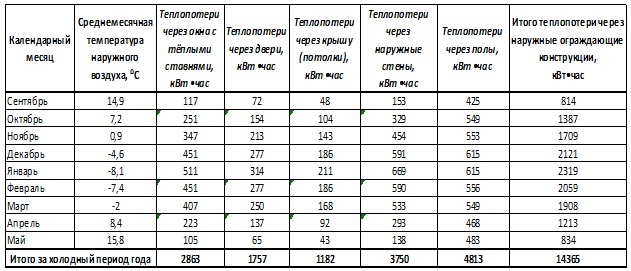 В табл. 2 отображен расчет теплопотерь через наружные ограждающие конструкции за холодный период года. Для Ростовской области принимаем его равным 9 месяцам, так как в летний период здание не теряет тепло, а, наоборот, набирает его.