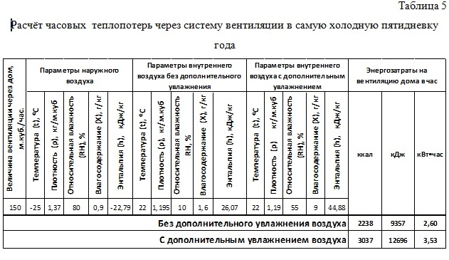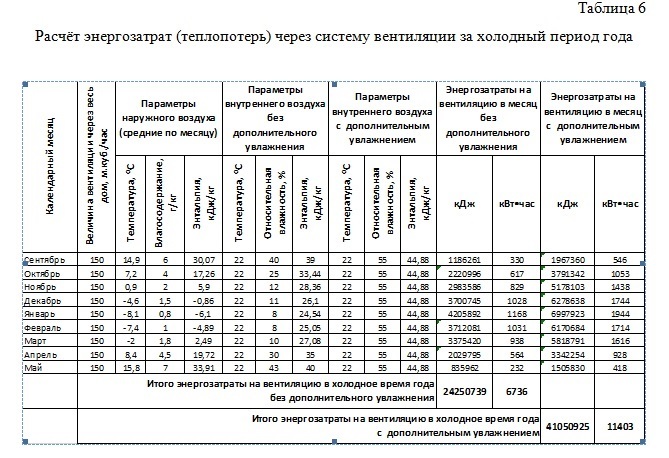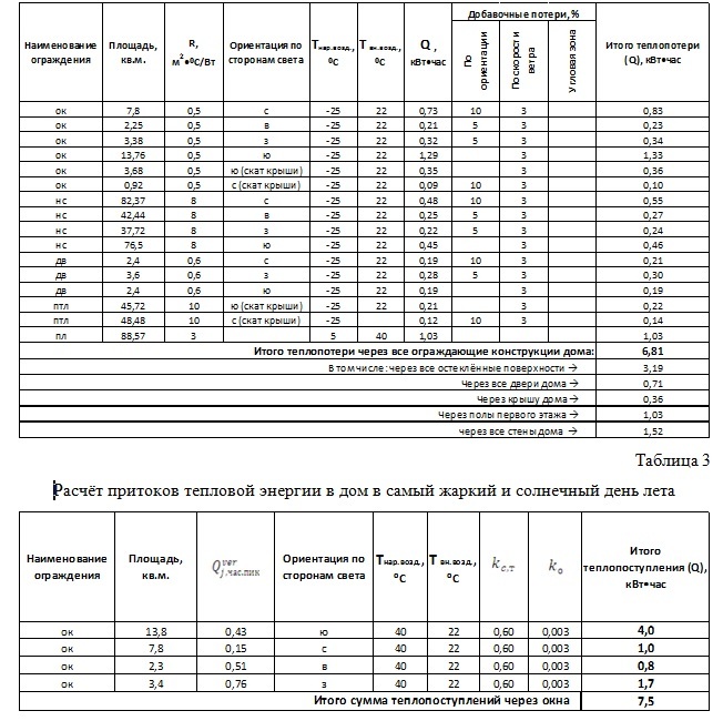 В табл. 8 учтены все вышеперечисленные пункты теплотехнического расчета здания. Единицой измерения всех показателей в таблице является [кВт × ч]. Знак «−» означает поступающее в дом тепло. В столбце «Тепловой баланс теплопотерь и теплопоступлений» минусовые значения означают избыточное поступление тепловой энергии в здание, на утилизацию которой необходимо затрачивать энергоресурсы. Знак «+» означает потребность в энергоресурсах, необходимых для нагрева (воздуха, помещений, воды). Значение сопротивлений теплопередаче для стен 8 , для крыши 12 [5].