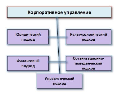 На рис 2. показано, что исследование корпоративного управления разделяется на несколько различных подходов, таких как: юридический, культурологический, финансовый, организационно-поведенческий и управленческий.