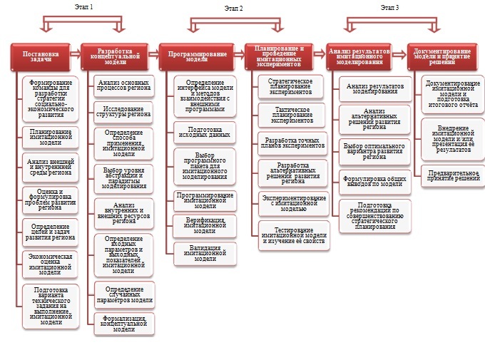 В рамках методического подхода разработан алгоритм построения имитационных моделей для поддержки процессов стратегического планирования региона (см. рис. 3), состоящий из трёх основных этапов:
