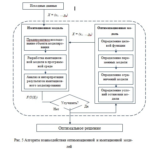 Алгоритм взаимодействия оптимизационной и имитационной моделей представлен на рис. 5. Как было уже отмечено выше, оптимизационная имитационная модель состоит из двух моделей, поэтому алгоритм её построения будет состоять из двух этапов, которые можно выполнять как последовательно (сначала построить имитационную модель, потом – оптимизационную), так и одновременно друг с другом.