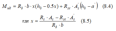 Предельный изгибающий момент для прямоугольного железобетонного сечения определяется площадью арматуры на погонный метр Аs и расстоянием h*=h0-x/2 от нее до центра сжатой зоны бетона x, согласно п.8.1.9 [4] находится по формуле 8.4.