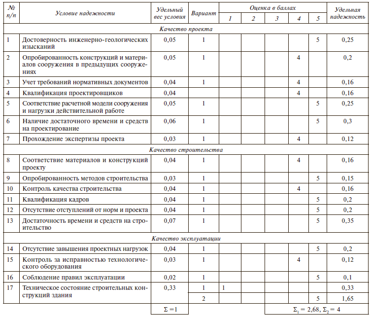 где Рi - удельная оценка надежности, получаемая умножением удельного веса условия на оценку в баллах. Полученные значения b сравнивают со шкалой оценок надежности, которые представлены в таблице 2.