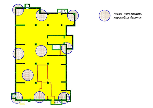 План многоэтажного здания имеет нессимитричную форму, поэтому локализация карста предполагалась в угловых точках здания, по центру периметра и под наиболее нагруженными колоннами (рис. 2).