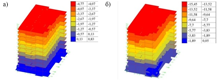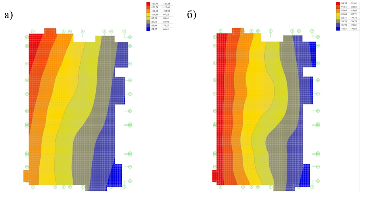 Анализ вертикальных перемещений показал, что в случае без карстовых провалов изополя перемещений соответствуют крену здания в поперечном направлении. Максимальные перемещения в схемах с воронками обнаружены с карстовым провалом в левом верхнем углу и составляют 128 мм (рис. 4а), что на 26% больше перемещений в схеме без воронок (рис. 4б) [8].