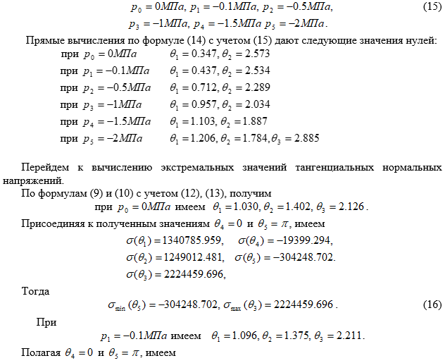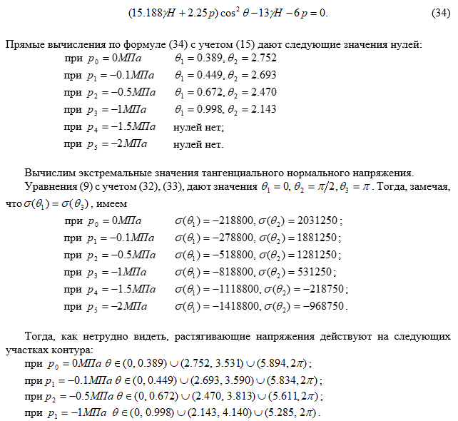 1. Приведенные в статье формулы для нахождения величины тангенциальных нормальных напряжений, определения их нулей и экстремальных значений на контурах выработок различной формы поперечного сечения позволяют проводить исследование напряженного состояния выработок, находящихся на заданной глубине, испытывающих равномерное внутреннее всестороннее давление при заданных физико-механических свойствах горной породы.