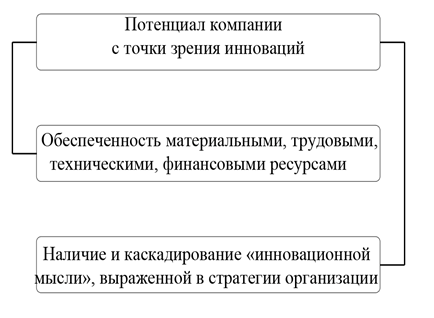 По авторскому мнению, должный уровень обеспеченности ресурсами не в соответствующей степени устанавливает инновационный потенциал компании, надлежащим обстоятельством выступает наличие и развитие в компании ее стремления идти по вектору инновационного внедрения.