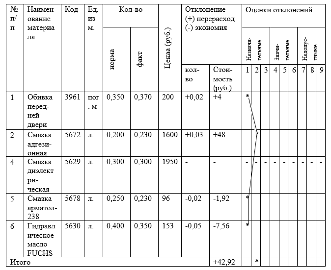 Далее производится определение их существенности в порядке, регулируемом внутренними стандартами предприятия. Наиболее предпочтительным инструментом выполнения данной процедуры, по мнению автора, служит шкала, градуированная на основе экспертных оценок в диапазоне от 1 до 9 баллов, разделенных на 3 группы: незначительные, значительные, недопустимые. В табл.1 представлен фрагмент контрольной ведомости расхода основных материалов на ремонтируемое изделие, отражающий интерпретацию выявленных отклонений.