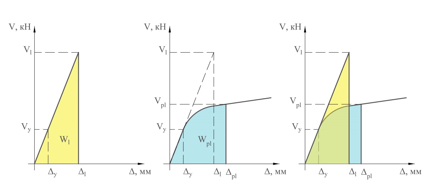 Согласно [5] для разрушения материала, независимо от того, какая будет приложена нагрузка (т.е. статическое медленное загружение, динамическое – быстрое загружение, однократное или многократное), необходимо затратить одно и то же количество энергии. Таким образом, энергия деформации линейной системы с модифицированной системой инерционных сил тождественна энегрии деформации системы с учетом пластических деформаций (рисцнок 5). Целевое значение энергоёмкости системы возможно определить на основании модифицированной системы инерционных сил: