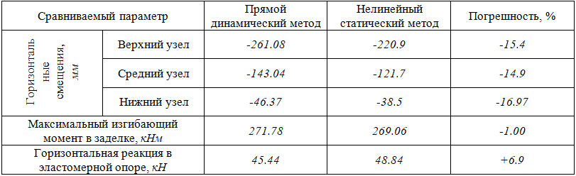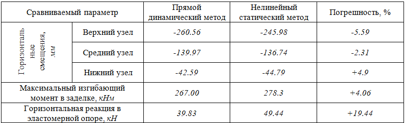 Для оценки погрешности откликов, полученных мультимодальным нелинейным статическим методом, сравним результаты с откликами, полученными на основании прямого динамического метода с использованием записей ускорений Erthq1-3.