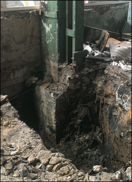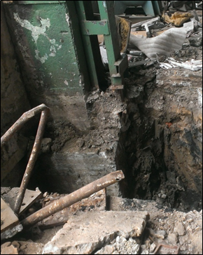 Рис. 2. Не завершенное усиление фундамента колонны, коррозия каркаса усиления железобетонного фундамента.