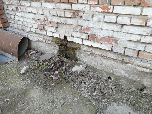 В приведенном примере так же присутствует техногенное воздействие на фундаментную балку в виде замачивания стоками атмосферных осадков. Техническое состояние такой фундаментной балки является ограниченно работоспособным. Развитие данного повреждения может привести к появлению трещины в фундаментной балке и образованию в ней пластического шарнира и появлению недопустимых деформаций. Устранятся такие повреждения путем оштукатуривания и восстановления формы балки. Так же следует устранить причины замачивания.