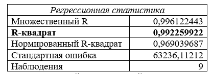 Коэффициент детерминации принимает значения от 0 до 1. Чем ближе значение к 1, тем сильнее зависимость. При оценке регрессионных моделей это интерпретируется как соответствие модели данным. Коэффициент детерминации равен 0,992259922, что говорит о том, что объясняемые переменные на 99% описываются рассматриваемой моделью.