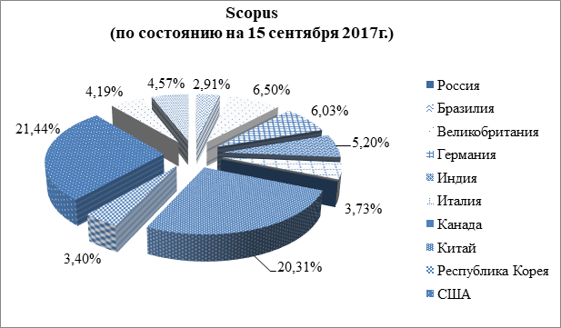 Как видно по данным, представленным на рис. 3, рис. 4, Россия имеет наименьший удельный вес в общемировом числе статей в научных журналах, индексируемых в международных базах данных. Доля отечественной науки в области публикационной активности составляет Web of Science - 2,56% и Scopus - 2,86%, для сравнения анализируемый показатель США составляет 24,42% и 21,44% соответственно, Китая 18,43% и 20,31% соответственно.
