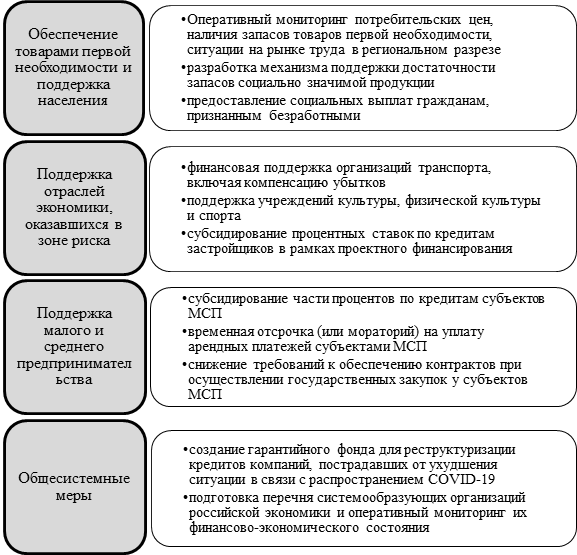 В связи с этим Правительством Российской Федерации 17 марта 2020 г. был одобрен план первоочередных мероприятий по обеспечению устойчивого развития экономики России в условиях ухудшения ситуации в связи с распространением COVID-19, включающий комплекс мер поддержки населения и бизнеса (рис. 2) [8].