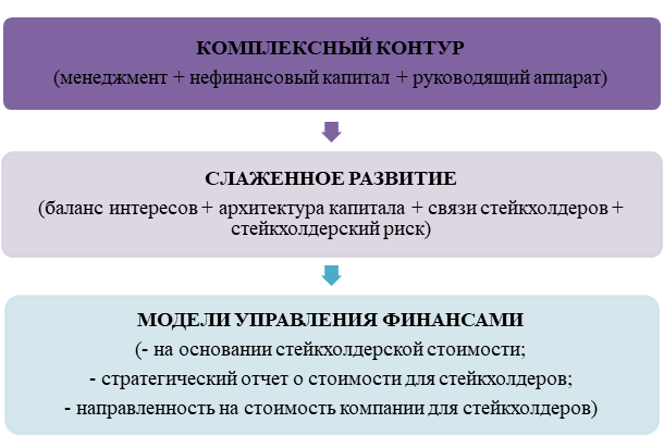 Как представлено на рисунке, центр модели – поле взаимодействия финансового, интеллектуального и социального капиталов как неотъемлемый аспект формирования стейкхолдерской стоимости. Здесь имеет место соблюдение интересов каждого из стейкхолдеров в целях реализации их сбалансированности. Как конечный результат – проводится аналитика и отбирается оптимальный стратегический путь управления финансами.