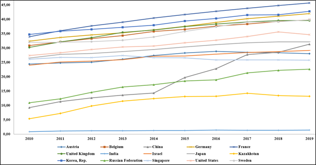 Наибольшая доля расходов на исследования и разработки в 2018 году была у Израиля – 4.95% и Кореи – 4.81. У России данный показатель крайне низок и составлял 0.99%, по сравнению с 2010 г. показатель снизился на 12%.