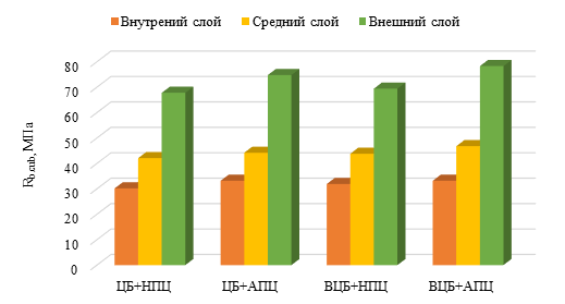 Рис. 2. Зависимость изменения кубиковой прочности вариатропных слоев при сжатии (ЦБ+НПЦ – центрифугированный бетон на неактивированном портландцементе; ЦБ+АПЦ – на активированном портландцементе; ВЦБ+НПЦ – виброцентрифугированный бетон на неактивированном портландцементе; ВЦБ+АПЦ – на активированном портландцементе)